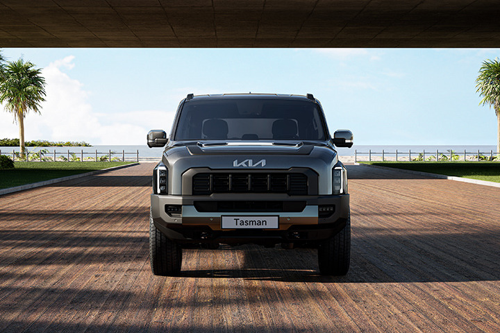 타스만은 기아의 최신 디자인 철학이 반영된 픽업트럭으로, 외관 디자인은 강렬하면서도 정교한 디테일이 돋보입니다. 기아의 상징적인 타이거 페이스가 전면부에 적용되었으며, 넓고 강인한 라디에이터 그릴이 돋보입니다.